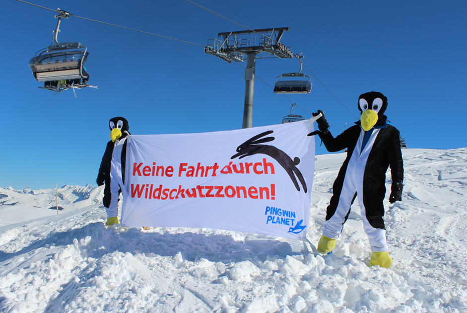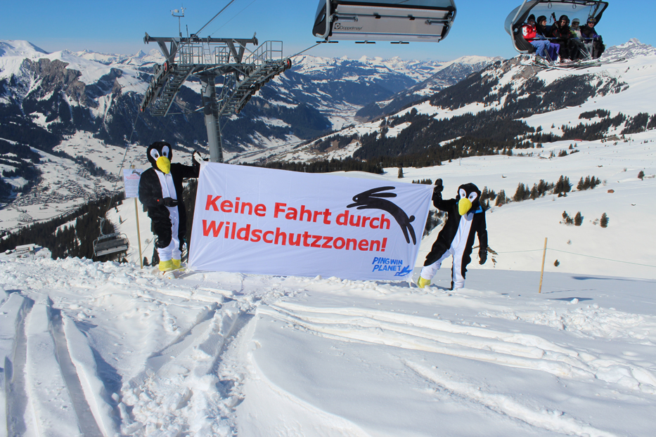Eine namhafte Zahl von Wintersportlern foutiert sich jedoch um solche Erkenntnisse und um Absperrvorrichtungen und Verbotstafeln, die zum Teil sogar Strafanzeigen androhen und fährt unverfroren durch die gekennzeichneten Wildtier-Lebensräume, wie Pingwin Planet in verschiedenen Skigebieten in Pistennähe festgestellt hat. Freiwillige von Pingwin Planet bewachten deshalb heute im Skigebiet Adelboden-Lenk (im Raum Metschstand/Hahnenmoos) solche Wald- und Wildruhezonen, um Ski- und Snowboardfahrer vom verbotenen Eindringen in diese Zonen abzuhalten oder sie zumindest für die Problematik zu sensiblisieren. Die Aktivisten brachten auch zusätzliche Informationstafeln an, welche vom Durchfahren der Wildruhezonen abhalten sollen. Eine andere Gruppe von Freiwilligen von Pingwin Planet verteilte Flugblätter mit Informationen zur Aktion.